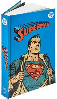 DC: Superman (The Folio Society, 2025) packs many aspects into the collection, including a reproduction of the original 1939 first Superman comic teased in the recent Warner Brothers’ Superman movie with the back cover’s Superman breaking chains.