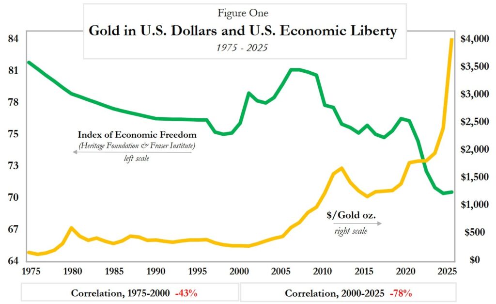 Substantive change has occurred in the subjects examined in my second book, Gold and Liberty (AIER, 1995), since it was published three decades ago. That change has been mostly negative, unfortunately, especially during the first quarter of this century. As economic liberty has decreased, gold has increased, a historical pattern which is by no means random.