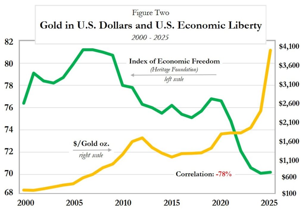 Figure Two plots the dollar-gold price and US economic freedom for this century only. The inverse relation between gold and liberty is even more noticeable.
