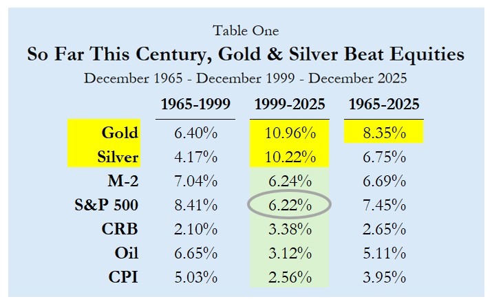 It’s as clear now as it was in 1995 that gold is an ideal monetary standard, even though sovereign powers at times (and for the entirety of this century) have refused to recognize or use gold for that crucial purpose. But consider just one important implication, pertaining to investments. Precisely because (and to the extent) sovereigns refuse to recognize gold, to be fiscally free (profligate), the result is nonetheless bullish for gold. By not making their money “as good as gold” and precluding a return to a gold standard, sovereigns make possible returns on gold that are very good indeed – often superior to those on the most popular alternative: equities. Table One illustrates how fiscal profligacy and monetary excess have favored returns on gold relative to those on the S&P 500. Not shown is that gold has outperformed the S&P 500 in nearly two-thirds of the years this century, by an average of +17 percentage points per year; it underperformed only one-third of the time by an average of -14 percentage points. Oddly, most investment advisors eschew gold and routinely recommend large portfolio shares in equities.